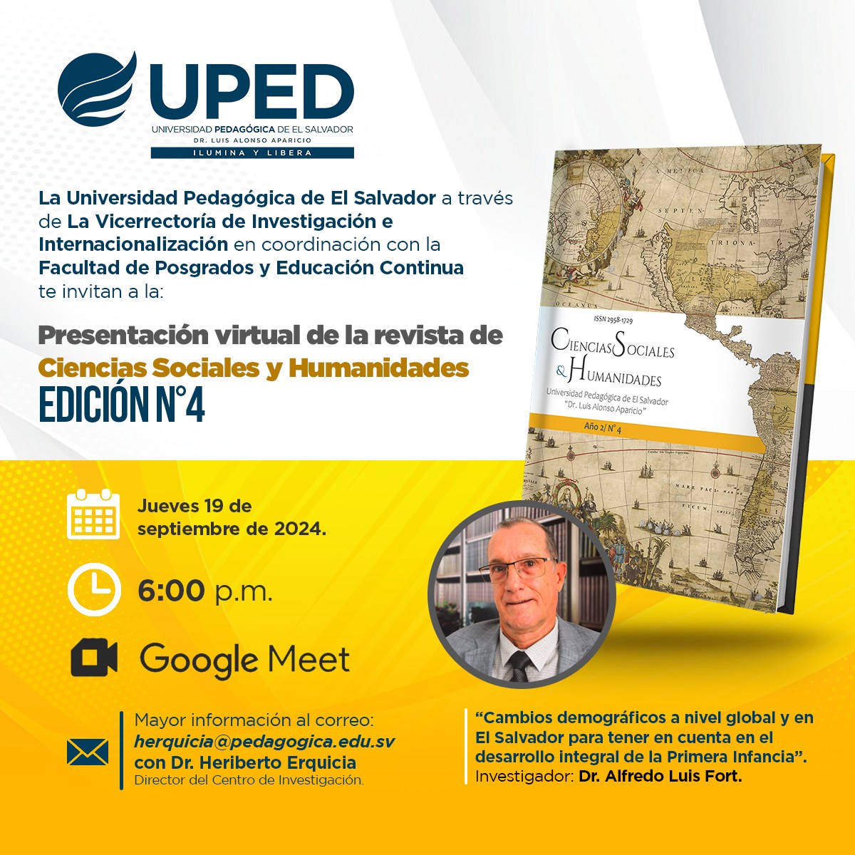 La Universidad Pedagógica de El Salvador a través de la Vicerrectoría de Investigación e Internacionalización en coordinación con la Facultad de Posgrados y Educación Continua te invitan a la: Presentación virtual de la revista de Ciencias Sociales y Humanidades Edición N°4 .